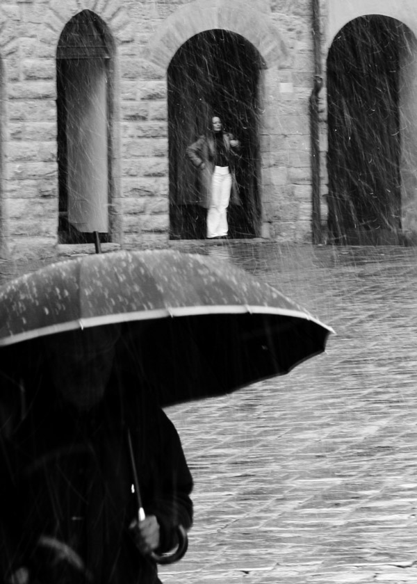 Un immagine che trasmette il disagio di una pioggia magari imprevista. Non male come bianco e nero. Avrei voluto il soggetto in primo piano maggiormente a fuoco. Ciao Tiziano Ok!