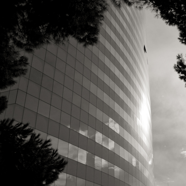perchè la struttura a vetri, che riflette il cielo e le nuvole, sembra una struttura futuristica, mentre il b/n, il grigio, la luce intensa, mi porta indietro nel tempo, come se guardassi uno scatto di tanti e tanti e tanti anni fa..