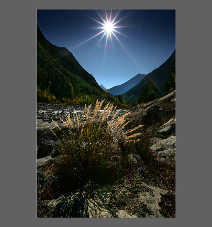 A terra l'ampia superficie grigia, il nastro scuro, nudo e sassoso su cui spesso il nostro cammino si compie... Ma fra il verde che ricopre le pareti delle montagne emerge in pp la incredibile luminosità di questa raggiera di steli, dorati e vividi, investiti di luce oltre ragione.... simbolo di una forza che nasce anche là dove meno ci aspetteremmo di vederla trionfare.