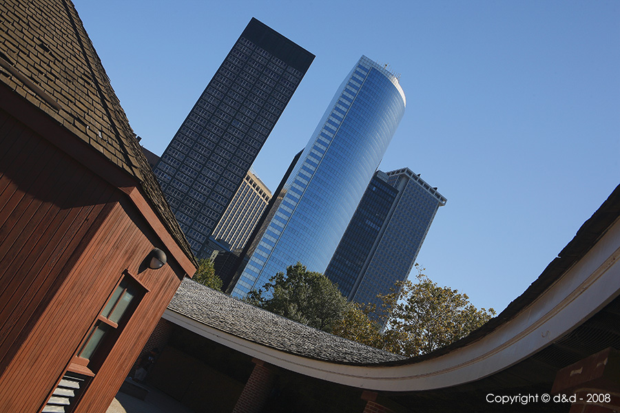 La linea curva a destra ben accompagna lo sguardo dall'angolo in basso a destra fino a scoprire i grandi grattacieli sullo sfondo, in una inquadratura che avvicina, alla fine, due costruzioni così diverse, alcune altissime e in vetro e acciaio, altre basse e in legno..