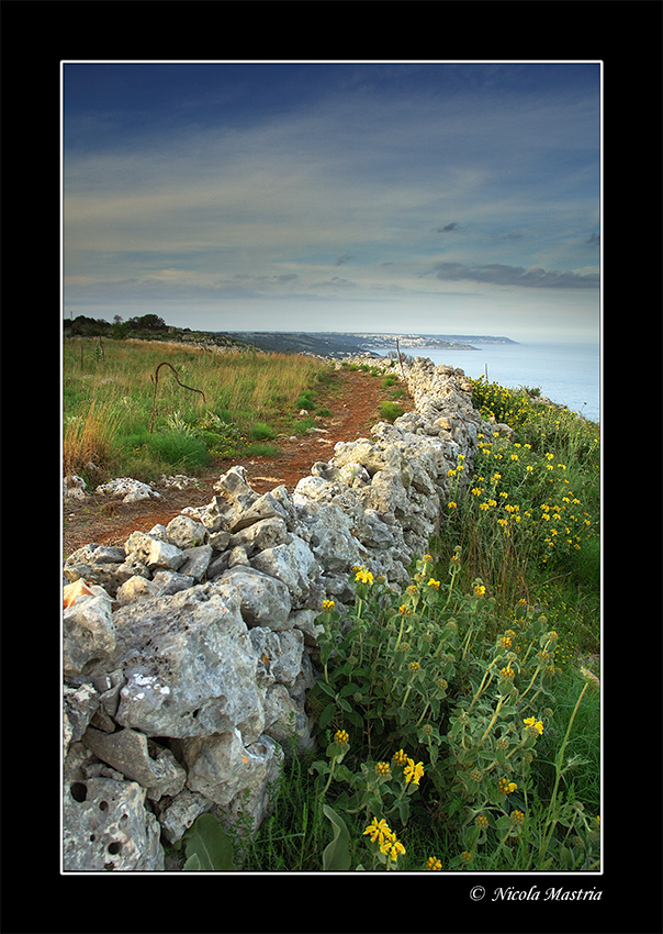 Ottima composizione con la stradina sterrata e la fila di pietre che conduce lo sguardo, in mezzo ai fiori ed ai prati verdi fin verso la costa frastagliata che s'intravvede all'orizzonte.