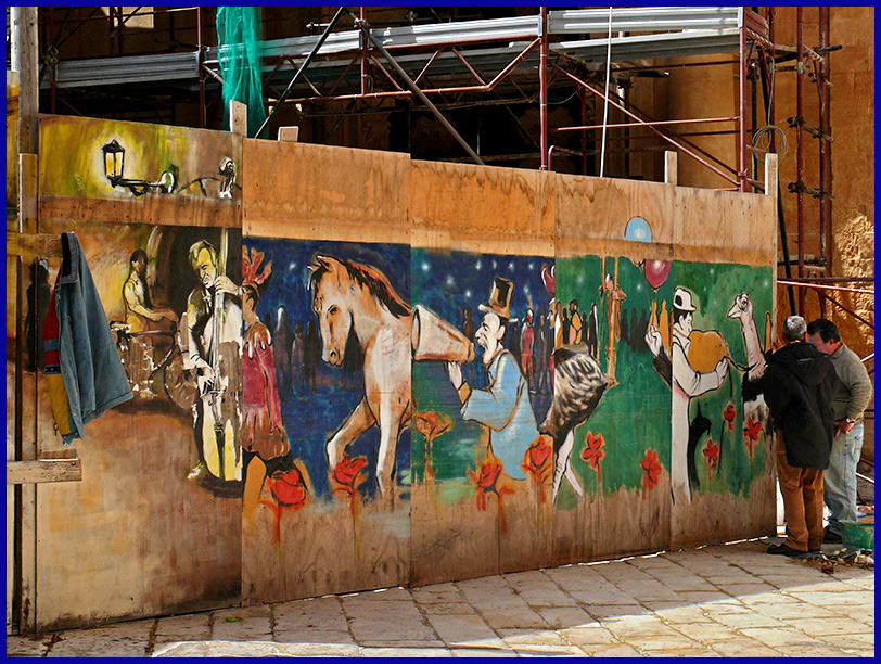 Che bello essere riusciti a trasmorare una protezione da cantieri in una rappresentazione visiva sospesa fra teatro e circo. Un plauso all'artista che ha fatto i disegni e uno a te che hai saputo sfruttare l'occasione. Poi hai fatto bene a includere i soggetti umani e quella giacca...attaccata all'asse...stupenda espressione di casualità sul posto di lavoro. Bravo. Tiziano