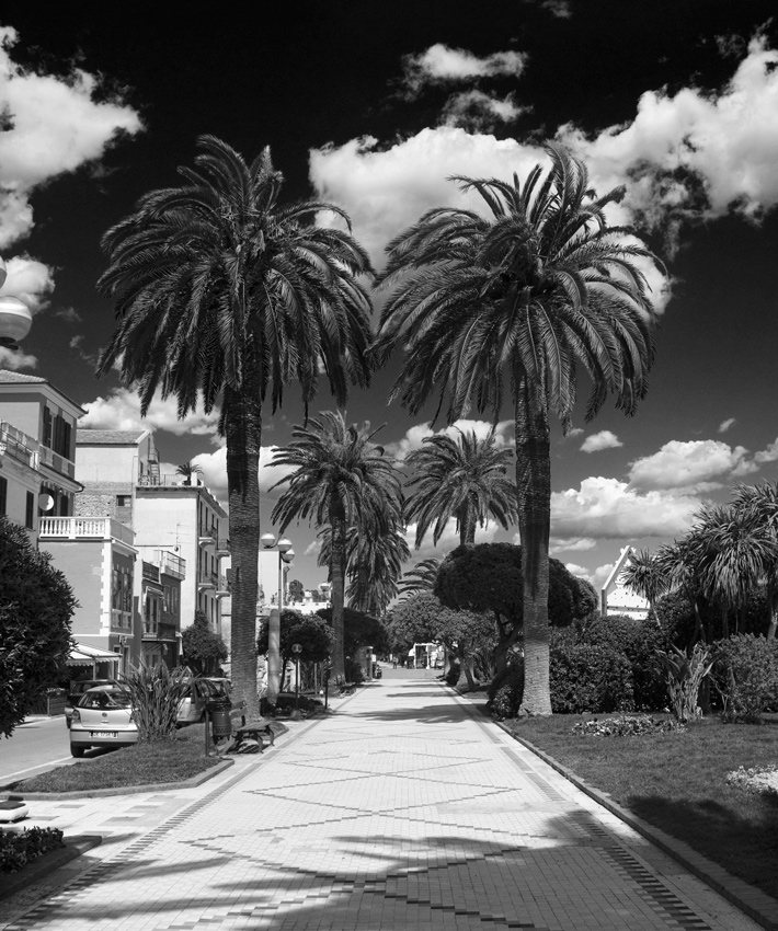 In questo tuo b.n. ritrovo tutto il fascino dei tuoi paesaggi tanto dettagliati e particolari. Anche quì in questo viale così pieno di " civiltà " e modernità si coglie qualcosa di indefinito e misterioso. Saranno quelle magnifiche palme ?