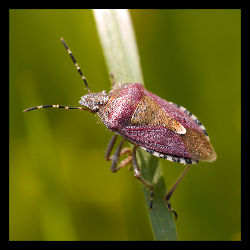 ottima la maf e l'ingrandimento, peccato per il riflesso sparato sulle "spalle" della cimice. ottimo il taglio della foto, che è resa dinamica dalla posizione diagonale dell'insetto. Bravo come al solito