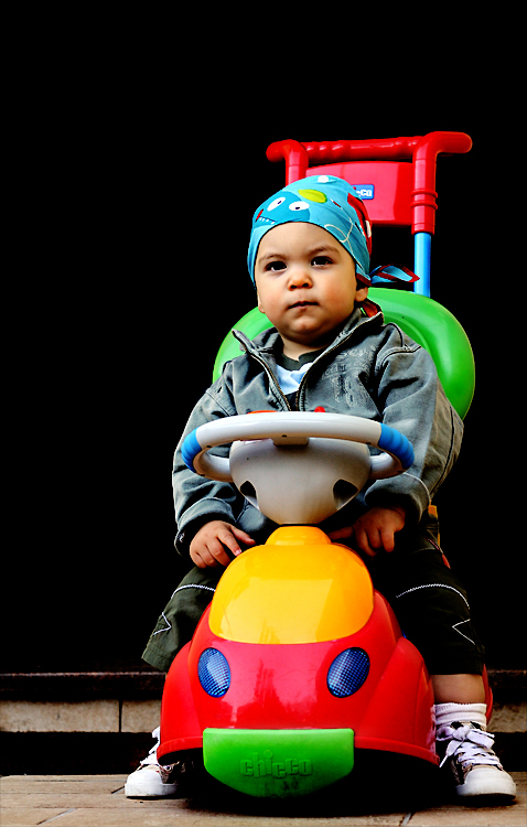 Mi piace, bel contrasto in cui vedo da una parte l'espressione del bimbo, lo fondo nero e la bandana e dall'altra i colori, il gioco, il giocattolo. Forse un po' troppo contrastata . |