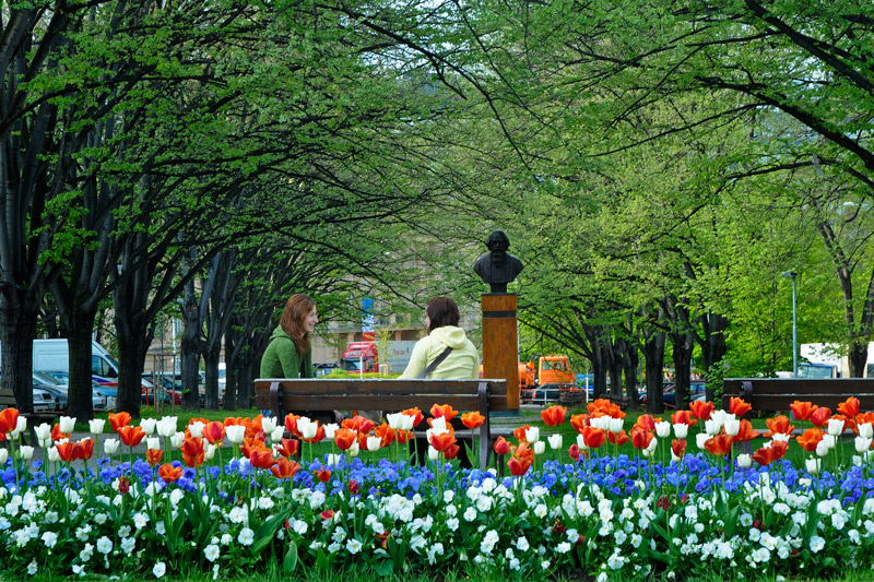 Penalizza molto il fatto che ci sia un po' troppo paesaggio urbano oltre la linea del verde: camion, auto, autocisterna... e pure quel mezzobusto su parallelepipedo. Forse, ma parlo per ipotesi perché ovviamente l'unico modo per saperlo è trovarsi sul posto e provare, avrei provato a limitare la profondità di campo, oppure avrei provato ad abbassarmi ulteriormente sotto la linea dei fiori.
