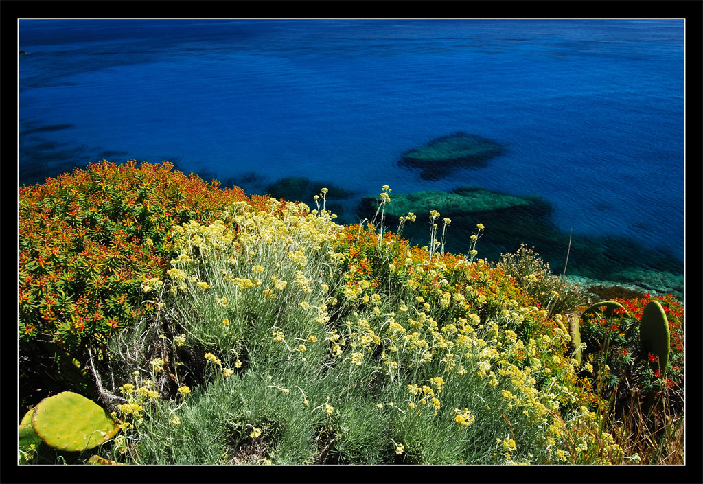 Molto bello il contrasto dei colori il blu del mare e la flora. Ottimo scatto. ciao |