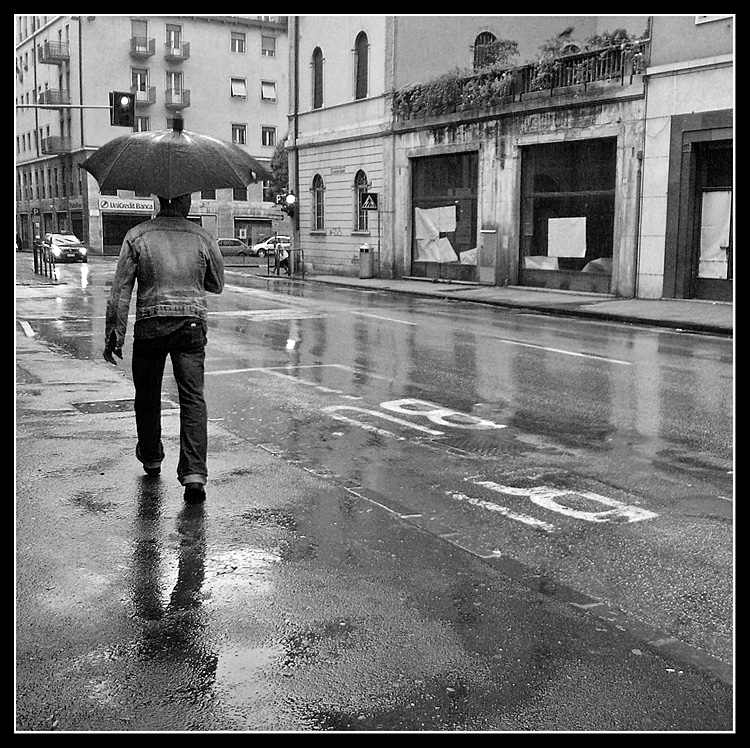 Mi piace la composizione di scena, persona - strada bagnata - semaforo - auto - vetrine, tutto molto ordinato e ben distribuito. Buono il B/N