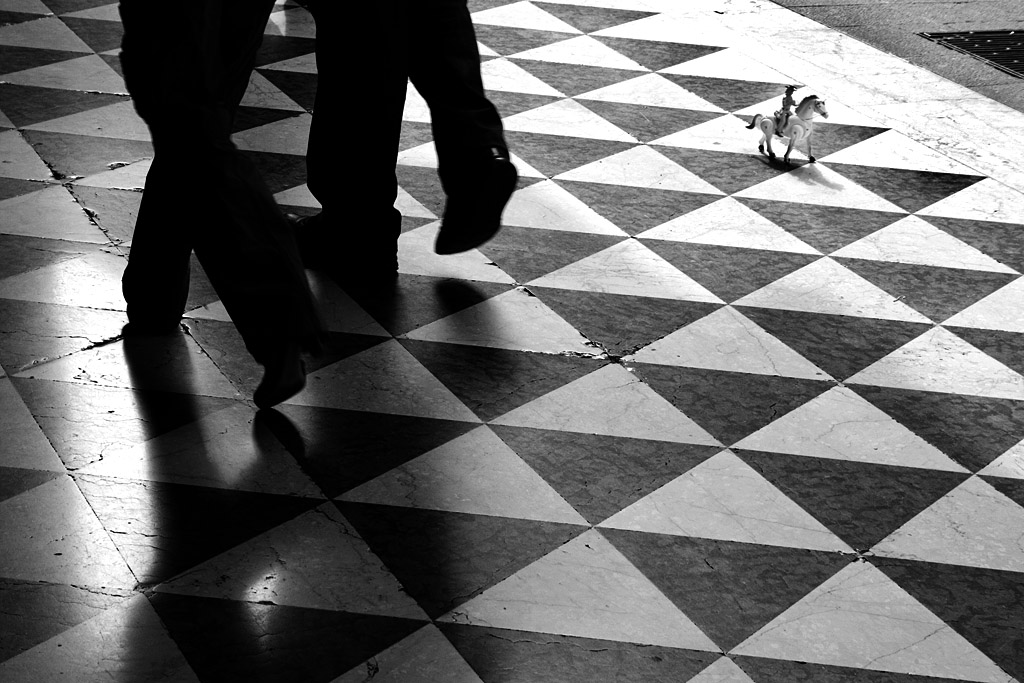 Non vorrei dare una mia interpretazione "forzata" alla foto, ma secondo me i due soggetti sono l'uno in funzione dell'altro: le quattro gambe a sinistra, con i loro neri kiusi li considero un elemento unico, ke ricorda le zambe di un cavallo, come quello presente sulla destra..