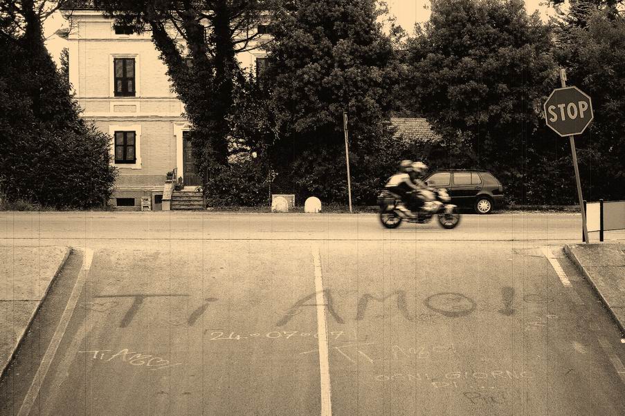 Allora le linee verticali sono un effetto di invecchiamento della foto, che ho scoperto su nero 7, la foto è digitale, ieri passando per dei palazzi affacciandomi ad un balcone ho visto la enorme scritta e mi sono riproposto di fare altre foto, come vedrete dalla foto che aggiungo la scritta è in una salita di un parcheggio sotterraneo di un condominio, penso che l'amata si affacci ogni giorno dal suo balcone per vedere tale scritta...[/img]