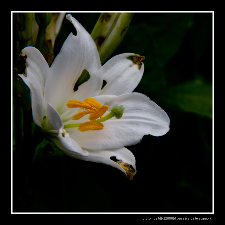 hai voluto far risaltare i pistilli e pure il fiore........ e ci sei riuscito! forse avrei tolto le 2 folie in alto a sin! Ok!