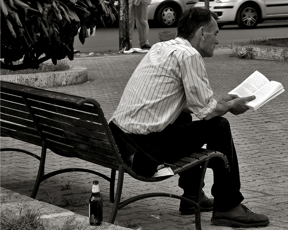Nel mio mondo ideale un uomo che legge un libro seduto su una panchina non dovrebbe rappresentare una scena inconsueta; nel mondo reale però è una situazione che si vede sempre più raramente, specie se quella panchina è situata non in un'area verde ma in mezzo al traffico cittadino. Questa eccezionalità non può sfuggire a chi è munito oltre che di macchina fotografica anche di quello che dovrebbe essere l'elemento di corredo essenziale, ovvero una spiccata sensibilità.