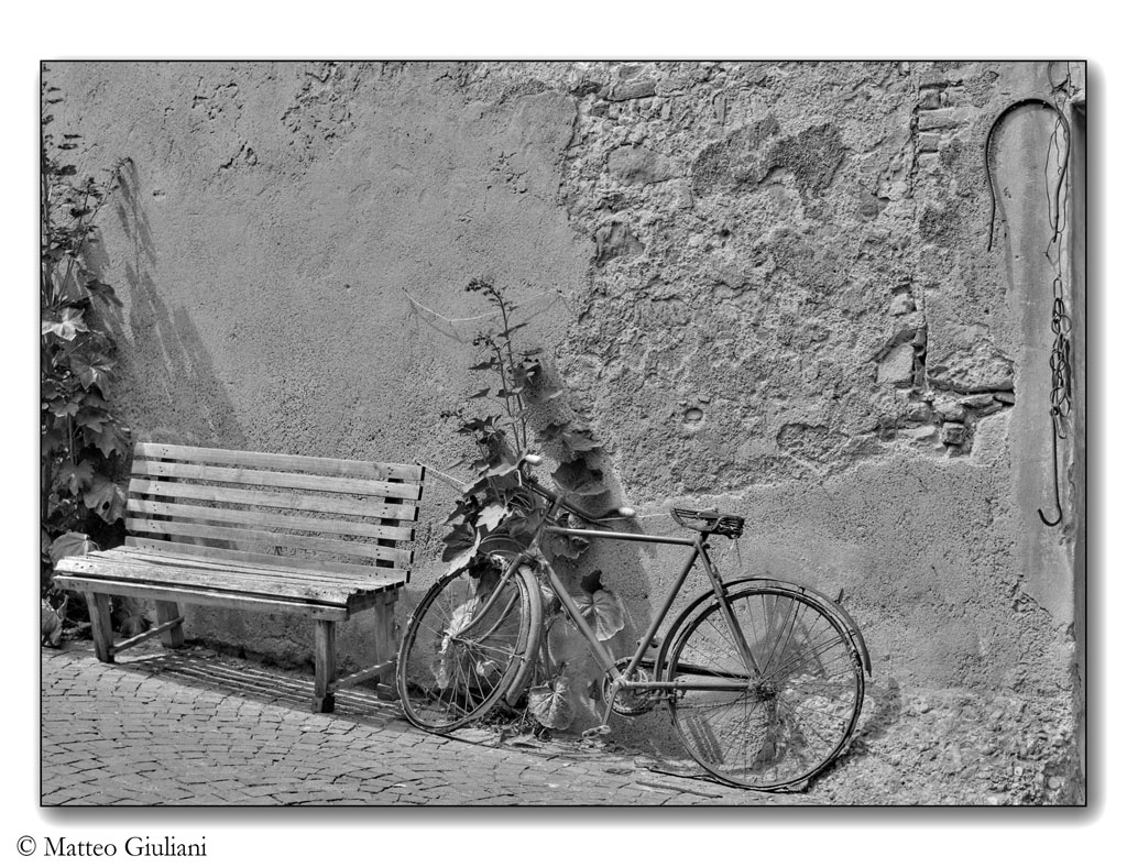 Proverei a far risaltare maggiormente il manubrio della bici, in modo da "staccarlo" dalle foglie e dal muro, esattamente come la panchina si stacca dal muro.