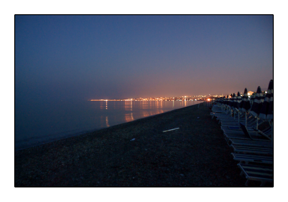 Infine rimane la composizione, a sinistra non c'è nulla che attiri l'attenzione e a destra c'è un netto taglio degl'ombrelloni, posizione completamente sbilanciata, spostati a destra, fai entrare il filare degl'ombrelloni a partire dall'angolo in basso, prendi come punto di ripresa un'angolazione più bassa, spostando la linea dell'orizzonte a un terzo del fotogramma superiore, in modo che il paese abbia la funzione di una quinta a cornice della composizione,