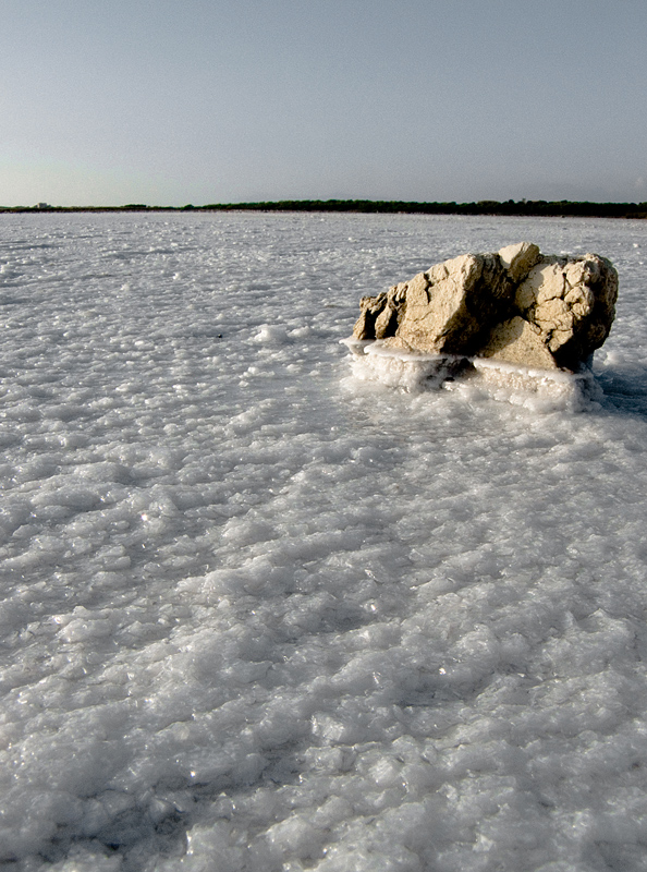 In realtà il sasso misura una ventina di cm di lunghezza e mi sono sdraiato nella salina proprio per mettere in evidenza i cristalli di sale in primo piano e per poter apprezzare i depositi sul sasso, ma ammetto che il taglio orizzontale non è affatto male.