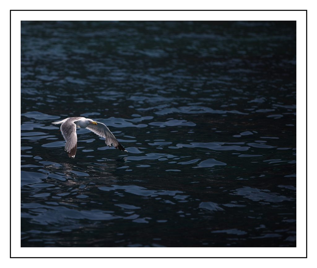 Bella la figura del gabbiano che risalta dalle tonalità scure del mare, ottimi i riflessi che disegnano l'acqua