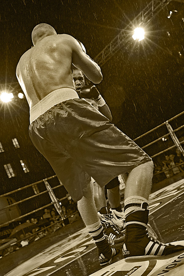 | allora...vediamo un po'...immagine un po' troppo statica...lampada a sinistra tagliata...piede a destra tagliato...il viraggio non da niente di piu alla foto...o B/N spinto o colore...non mi piace la resa dei calzoncini del pugile di spalle...schiarito le ombre?era scuretta?buona la chiusura del diaframma a creare le stelle...buono il punto di ripresa...buona la testa dell'altro pugile che fa capolino...buona la pioggia scenografica... _________________