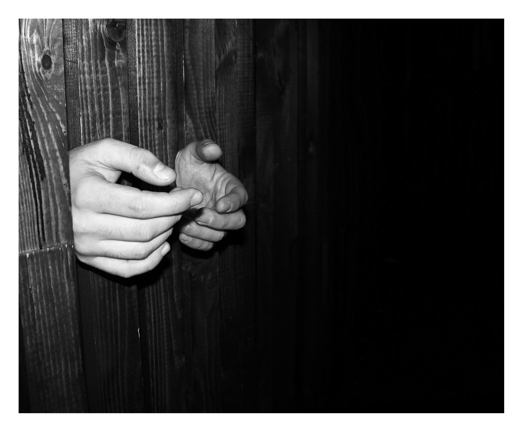 Mi trovavo ad una mostra di architettura, al centro della sala era esposta questa struttura di legno a misura d'uomo, e percorrendola facilmente ci si trovava ad immaginare una vera e propria prigione; da qui l'idea, grazie anche ad una persona che era con me che per gioco ha infilato le mani tra le assi, di imprigionare in un fotogramma quello che poi mille volte ritroviamo nella realtà in modi più o meno velati.