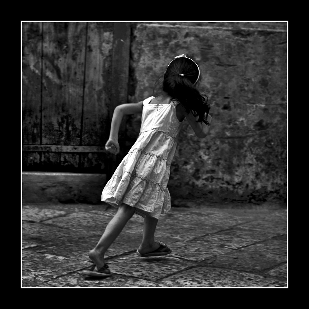 | Ci stai proponendo questa bambina in B/N da giorni in varie situazioni sempre però all'altezza. Questa sembra quasi tratta da una sequenza di scatti che vogliono documentare il movimento. Perfetta la mimica. Semra quasi fatta apposta... e invece i piedi un po' mossi e sollevati da terra, la mano un po' smarginata ci dicono che l'hai ripresa al volo. Complimenti. Tiziano |