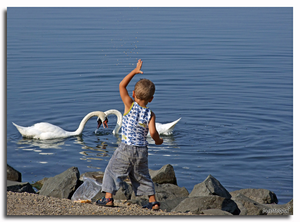 Molto bello questo scatto, i colori il gesto del banbino con il cibo fermato per aria come per incanto ed i cigni che si incrociano tutto è perfetto Ok! Ok! Ok!