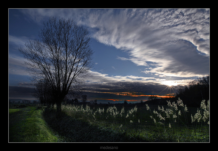 E così ecco il dosato controluce, perfettamente gestito a livello di esposizione, la graficamente ricca silhouette dell'albero, la contrastante tonalità calda del tramonto.