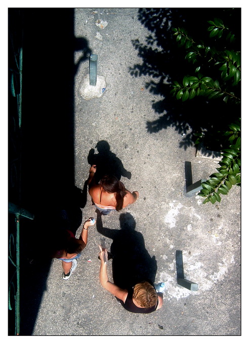 Tre persone... tre paletti... le ombre... la prospettiva... i colori... e te che scatti furtivamente dall'alto della tua finestra (ti ho visto sai! ) tutti aspetti che messi insieme creano una bella street, mi piace