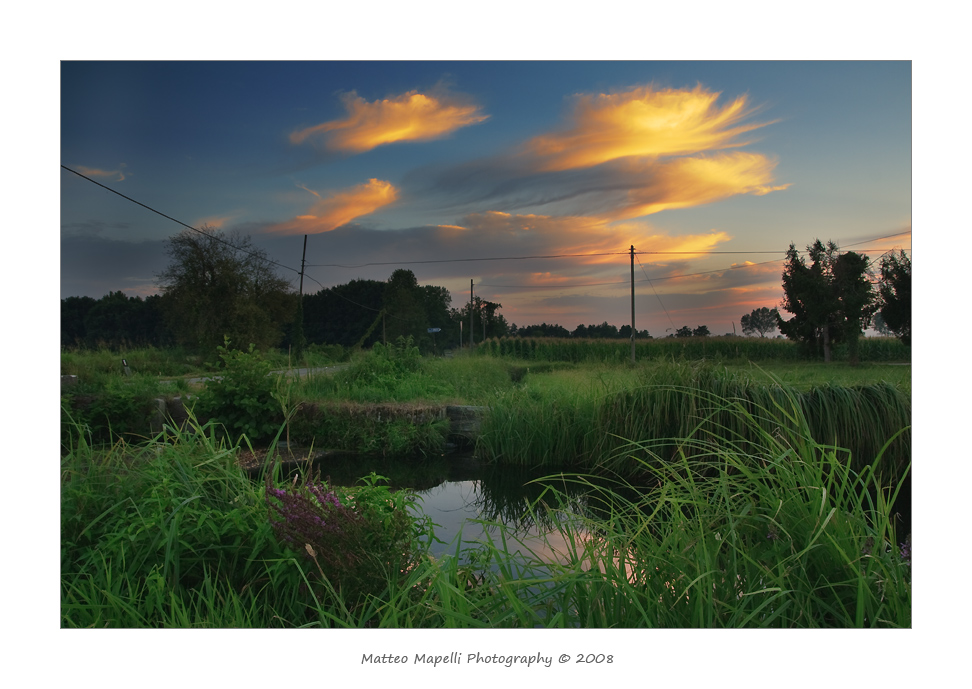 ..piacevole immagine ottenuta da una buona gestione della luce atta a valorizzare il cielo e le sue nuvole. Gradevole la resa dei toni che sul pp paiono un po co recuperati in pw.... l'occhio mi pare che rimbalzi tra lo stagno (??) in pp e le nuvole senza riuscire a scegliere tra uno dei due punti......