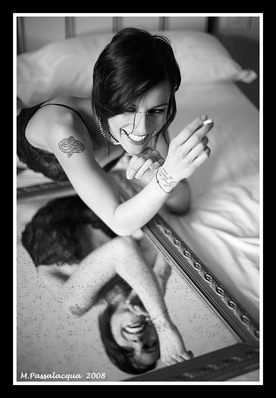 Il letto con il panneggio mosso del lenzuolo, ...i tatuaggi, ....l’intimo di pizzo nero ....lo stesso gioco intrigante di quel riflettersi del corpo di Daniela nello specchio, ....tutto sembra ricreare le note di un atmosfera calda di segreta seduzione che d’improvviso si risolve nell’incredibile spontaneità di quel sorriso sottolineato dallo sguardo che velocemente fuga di lato.