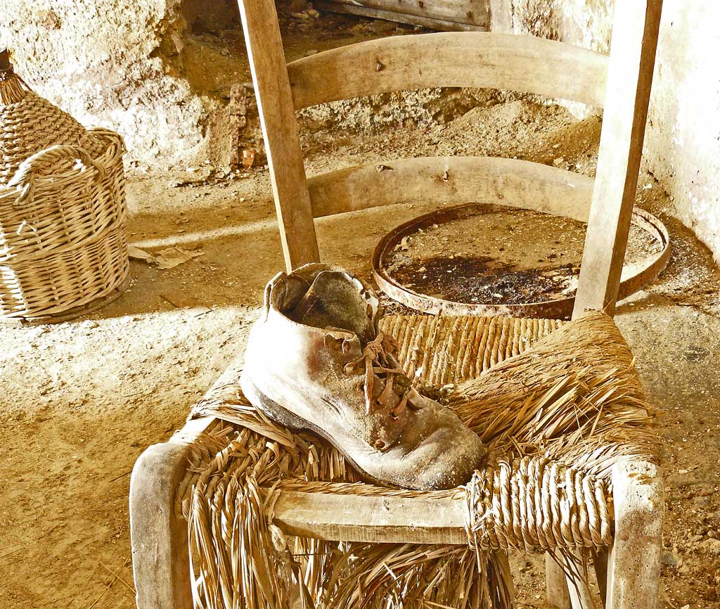 In questa foto secondo me è da salvare solamente il viraggio, particolare e di sapore antico come gli oggetti rappresentati. L'inquadratura pecca di fretta, la damigiana presa così a metà è un oggetto che risulta solamente di disturbo nella composizione così la porta (credo che sia la porta) sullo sfondo, l'esposizione la vedrei di uno stop sotto.