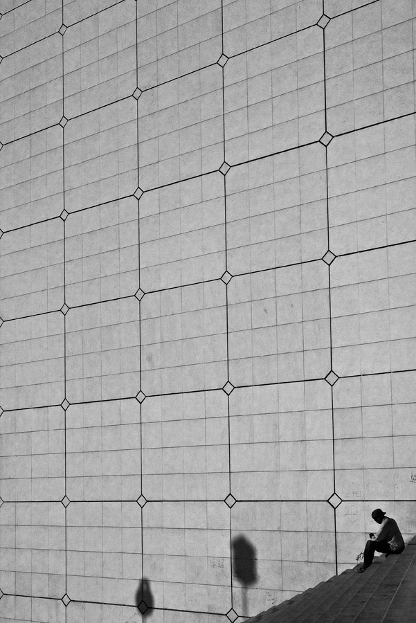 Dal mio punto di vista l'avrei preferita, qualora c'è ne fosse stata la possibilità, inquadrata leggermente più in basso ed a destra così da collocare utilmente la figura umana in prossimità dell'incrocio dei terzi inferiori: non perchè essa sia una regola in sè, ma solo perchè altrimenti la figura ed il suo rapporto con le geometrie appare sacrificato.