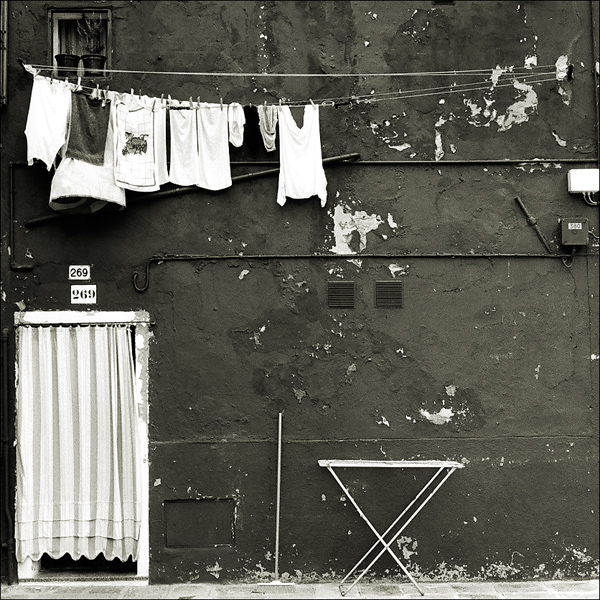 gran bello scatto, i bianchi si stagliano sulla quasi unormita' dei grigi della facciata e sembrano disegnare gli elementi di questa immagine. tendone, stendino, scopa, numeri civici, panni stesi. Il muro scrostato sembra collocare l'immagine in un tempo passato, quasi un'invecchiamento