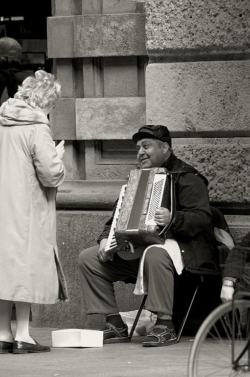 ciao, hai colto una simpatica scenetta e la resa del bn è buona...l'inquadratura non va però...ha tagliato la donna sulla sinistra e a destra quella ruota e quel braccio danno fastidio...io avrei aspettato un istante per far passare la bici e avrei usato un'inquadratura orizzontale allontanandomi un po così includento una porzione maggiore di strada avrei anche contestualizzato meglio i personaggi