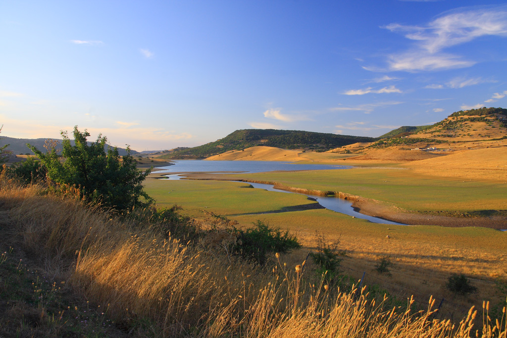 Bel paesaggio sereno, coi colori caldi del sole basso; i colori tenui mi fanno pensare più a una mattinata ancora fresca piuttosto che un pomeriggio, ma forse mi sbaglio. Molto belle le spighe selvatiche del primo piano, concludono il quadro idilliaco in modo molto valido. Veramente una bella foto. Dal punto di vista compositivo c'è un po' troppo cielo, ma d'altra parte, come decapitare quei batuffoli di nuvole a destra? Direi che hai fatto bene le tue scelte.