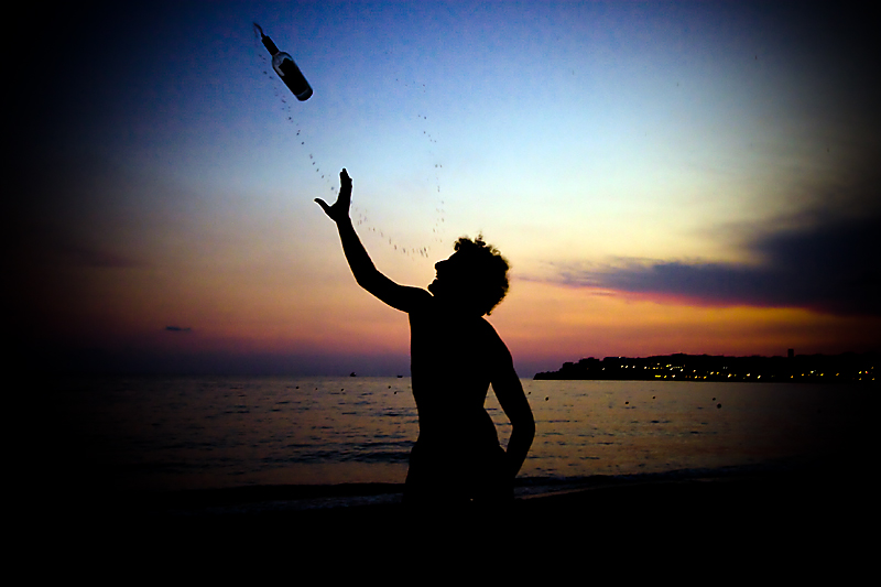 Mi piace questo scatto, ma forse non avrei lasciato quell'alone nero intorno non so, ottima la siluette, la bottiglia in aria, ed il liquido sospeso. Wink Ok!