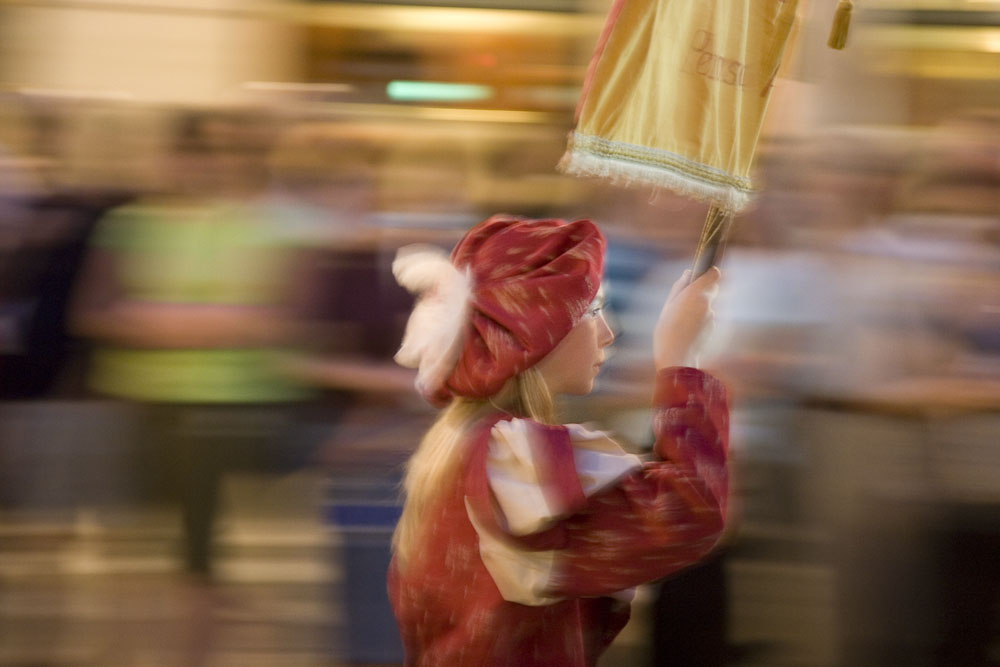 Bell'effetto questa sorta di panning che permette di intuire e visualizzare le persone ai bordi della strada che si godono la sfilata in costumi antichi.