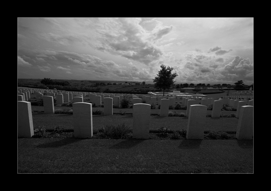 ..E' come se la forte luce del cielo riuscisse a portare tutta l'attenzione verso quell'albero, solitario, dopo questa fila di lapidi bianche che si ripetono su più piani.. Il cielo molto ricco di nuvole, che appesantiscono l'atmosfera, pur senza riuscire a spegnerla del tutto.. come se quella luce riuscisse a lasciare uno spiraglio di speranza, di vita, di rinascita..