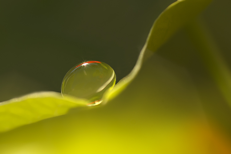 Ci sarebbe da approfondire tra riflessione della luce sulla superficie della foglia e la rifrazione della luce riflessa che attraversa l'acqua (corpo diverso dall'aria) e dall'effetto lente della superficie della goccia. Forse ne varrebbe la pena.