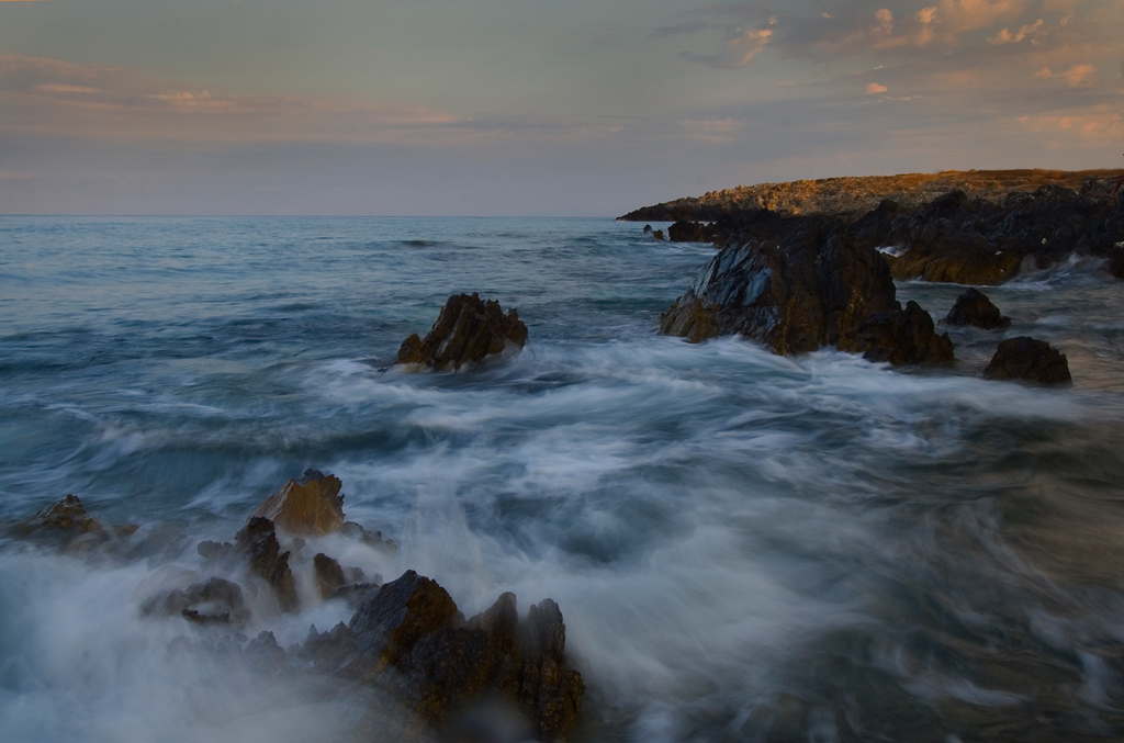 il mare è bellissimo, anche la scelta di quegli scogli, , ma forse avresti dovuto tagliare un pò di cielo, dato che non è molto interessante, nel senso che non ha colore importante o belle nuvole...
