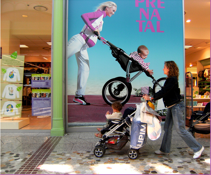 Accoppiata abbastanza semplice da realizzare, di conseguenza andava curata di più la parte compositiva: l'altro passeggino che sta entrando nella scena, il taglio della scritta in alto, le bruciature sotto.