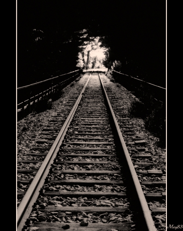 Ciao Mey.. qualcuno probabilmente storcerà un po' il naso, nel vedere quella rotaia che non parte esattamente dall'angolo in basso a destra, come fa quello di sinistra.. ma io non lo vedo come un fatto penalizzante, perchè vedo nel contrasto tra il nero della vegetazione e quella esplosione di luce nel centro il punto focale dello scatto, come se lungo la ''tua strada'' ci sia qualcosa di splendente e di intenso che ti aspetta, dopo il buio che circonda il tuo cammino..