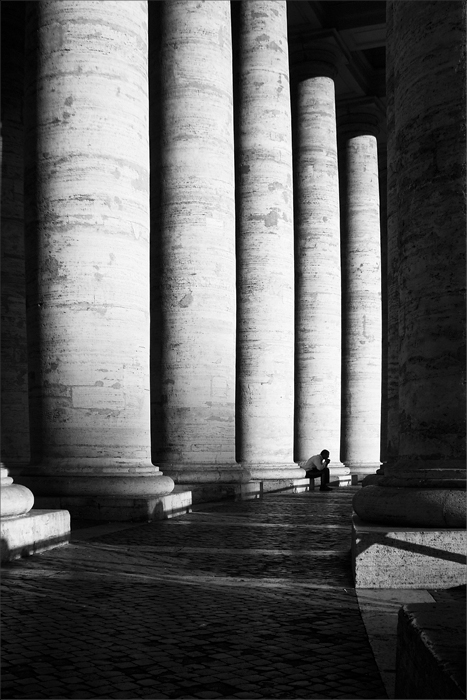 Il taglio quadrato l'avevo provato però mi piaceva di più così per la contrapposizione tra lo sviluppo verticale delle colonne e l'omino curvo... sono molto indeciso.... allego la versione quadrata.
