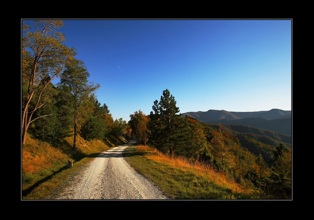Bellissimi questi colori autunnali, esaltati dal bianco della stradina.