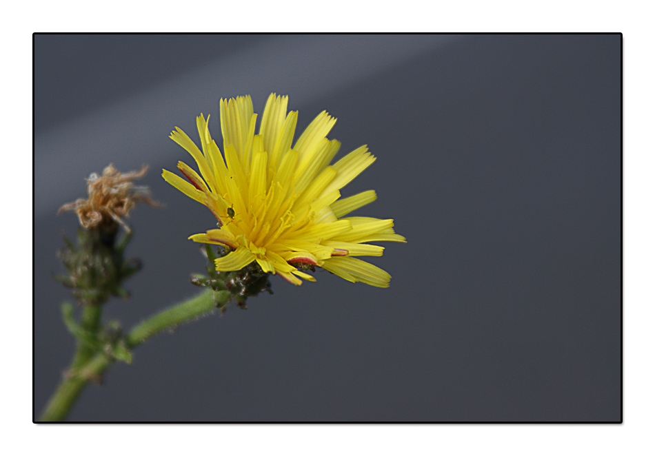 Lo sfondo ben neutro fa risaltare il bel colore giallo del fiore fresco che concettualizza bene il senso del titolo in contrapposizione all'altro sfuocato sullo sfondo.