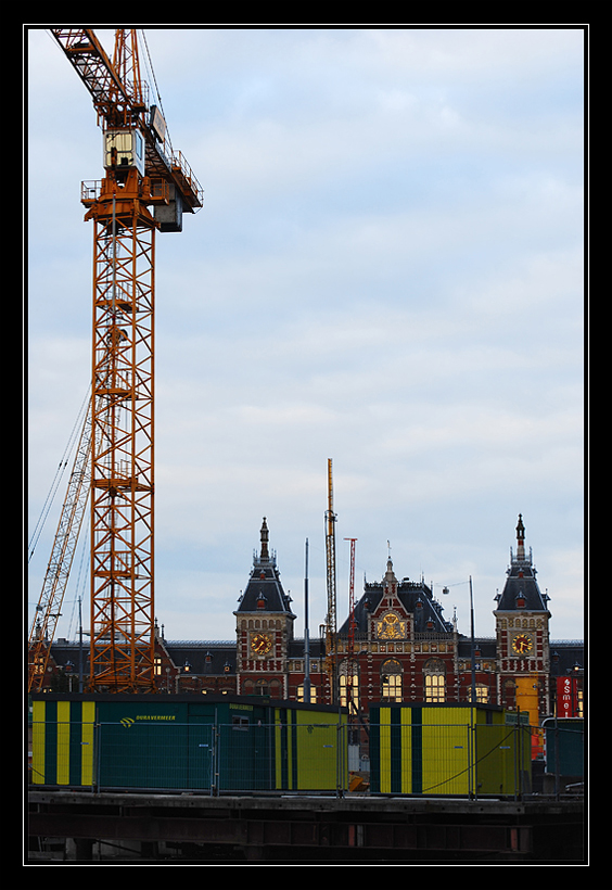 Senza dubbio un'ottima composizione, sei riuscito ad accostare e ad integrare molto bene elementi così diversi fra loro come l'edificio della stazione, la gru e le baracche del cantiere.