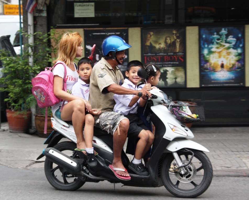 Ripresa molto simpatica, dove la prima regola in evidenza è la trasgressione, in barba a tutti i Codici Stradali di questo mondo, perfino quì ( immagino un Paese orientale ). Colpisce ancora dal punto di vista Sicurezza, l' estrema palese incoscienza della donna e i tre bambini che si affidano all' unico casco indossato dall' allegro conducente.