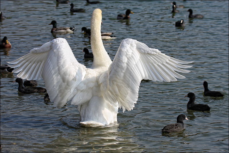 La scena è simpatica e sei stato bravo a gestire il bianco delle ali del cigno ma mi sembra un pò strettina in alto _________________ http://www.flickr.com/photos/morganamor |