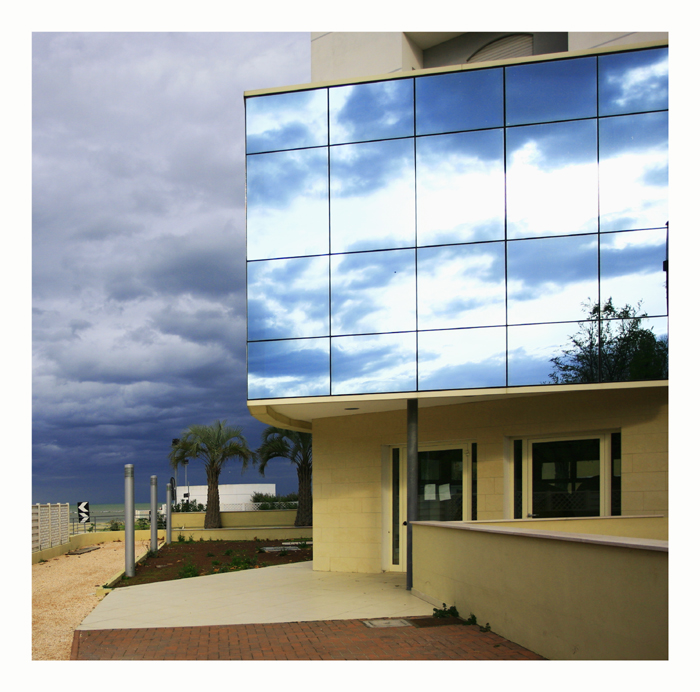 l'idea è buona , ma se avessi stretto l'inquadratura sulla vetrata ed il cielo avresti avuto una foto d'impatto,con il cielo nuvoloso scuro contrapposto al cielo nuvoloso chiaro riflesso e ingabbiato.