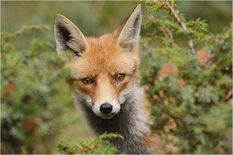 Bellissimo e tenerissimo questo sguardo di volpacchiotto che ti scruta da una macchia di ginepro.