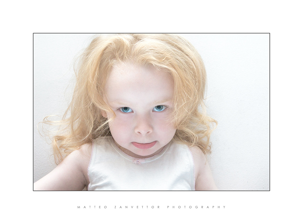 L'illuminazione di questo scatto è data dal flash sparato in verticale sul soffitto ed un panello riflettente posto poco sotto la vita della bimba, sfondo parete bianca e in PW ulteriore aumento dell'esposizione.