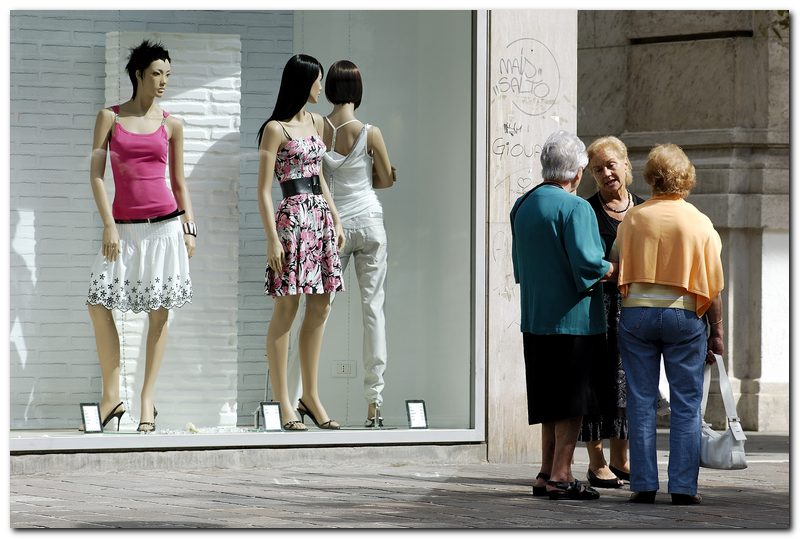 manco a farlo apposta hai beccato due signore in gonna ed una in pantaloni, proprio come i manichini... hai anche catturato un momento in cui solo una delle signore si vede bene in faccia, proprio come i manichini.... Peccato che nessun manichino avesse una borsa... sarebbe stata perfetta